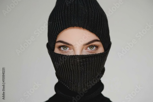 A woman wearing a black knitted balaclava looks directly at the camera. AI.