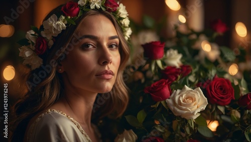 A woman wearing a floral crown gazes softly, surrounded by red and white roses. The warm candlelight adds a romantic and dreamy feel to the elegant portrait