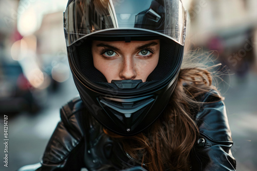 person, portrait, studio, beautiful, emotion, model, pretty, expression, posing, happiness, friendly, human, pose, shot, adorable, woman, motorcycle helmet, closeup, leather jacket, young adult, street, daytime, long hair, urban, depth of field, female, modern