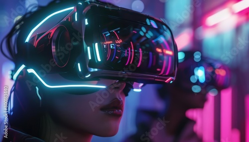 woman, wear, headset, dark, room, neon, light, technology, future, play, augment, escape, style, trust, high technology, growth, hyper, strange, concept, close, fun, problem, challenge
