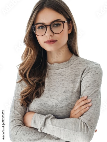 A woman wearing glasses stands with her arms crossed, appearing confident and self-assured