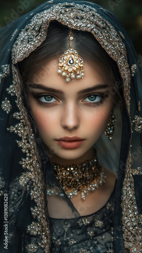 beauty, portrait, face, eye, make-up, jewellery, necklace, headdress, veil, fabric, bead, pearl, gold, ornate, detail, skin, texture, expression, gaze, piercing, light, shadow, highlight, depth, colours, sharpened, symmetric, soft, smooth, elegant, traditional, culture, heritage, adornment, accessory, style, fashion, glamour, delicate, refined, aesthetic, captivating, alluring, serene, beautiful, feminine