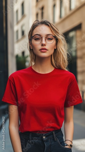 A woman wearing red color t shirt mockup; with glasses; on the street; front view