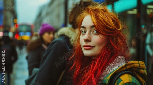 A woman who has beautiful red hair is wearing a stylish plaid jacket