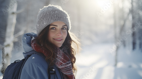 A woman with a backpack walks in the winter forest. Snow-covered forest, beautiful Christmas trees. Beautiful winter landscape, cold nature. Stunning scenic view. Outdoor adventure. Generated AI