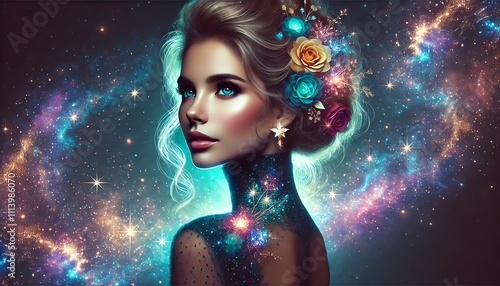A woman with a celestial, cosmic theme