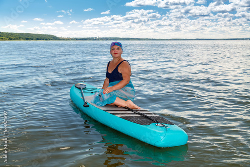 A woman with a Mohawk in a pareo on a SUP board in a lake against the background of white clouds on a clear blue sky.