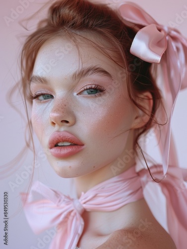 A woman with a pink bow in her hair and pink dress