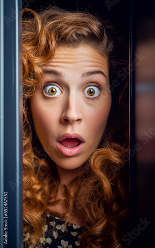 A woman with a scared and shocked expression peeks through the semi closed door
