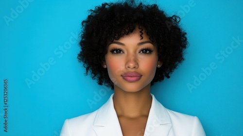 woman, short, curly, coiffure, wearing, white, jacket, blue, hair, standing, young, front, beauty, wall, african, person, face, portrait, black, female, attractive, model, american, adult, afro, fashion, 1, expression, happy, posing, lifestyle, pretty, natural, cute, looking, ethnicity, casual attire, background, style, smiling, lady, eye, closeup, skin, happiness, space, copy, confidence, dark
