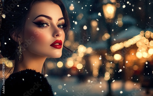 A woman with bold red lips, shimmering gold eyeshadow, and flawless skin, standing in front of a snowy Christmas village lit by lanterns