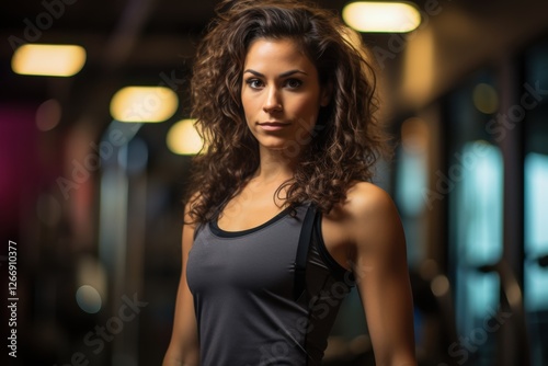 woman, curly, hair, standing, gym, wearing, grey, top, posing, tank, young, female, beauty, adult, fitness, person, sport, fit, lifestyle, healthy, body, exercise, portrait, physical exercise, black, attractive, model, training, strong, athlete, caucasian, active, strength, pretty, power, lady, slim, sporty, muscular, shape, health, muscle, activewear, sportswoman, brunette, smile, indoor, happy, club