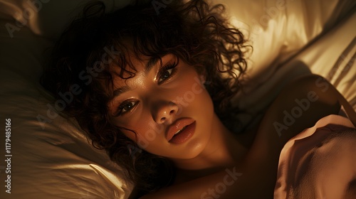 woman, curly, hair, mixed, racial, background, lying, bed, closeup, shot, her, face, night, warm, lighting, looking, directly, camera, wearing, soft, pink, shirt, shadowy, room