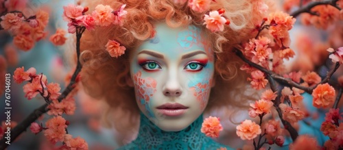 A woman with fiery red hair and blue paint on her face gazes through vibrant magenta flowers, her eyes filled with artistry and grace