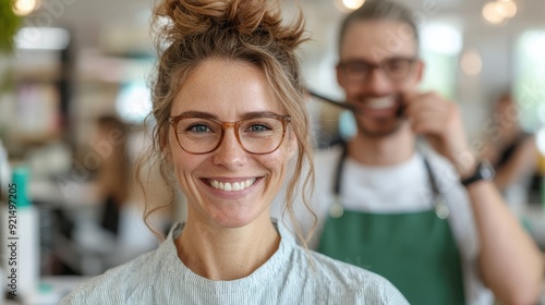 woman, smiling, goggles, blurred background, salon, modern, welcoming, pleasant, light, casual attire, cheerful, happiness, comfort, friendly, cosy, contemporary, customer service, beauty, coiffure, updo, eyewear, apron, mirror, bright, joyful, content, trendy, fashion, attractive, positive, satisfaction, business, professional, natural, daylight, clean, fresh, stylish