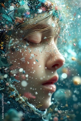 woman, eye, closed, head, covered, confetti, face, nose, lip, beauty, sparkle, bubble, water, dream, fantasy, art, digital, surreal, vibrant, colours, floating, aethereal, surrounded, burst, closeup, portrait, young, tilted, state, expression, background, mix, blue, white, small, particle, neck, hair, styled, loose, wave, cascade, down, back, chaplet, flower, leaf, quality, conveying