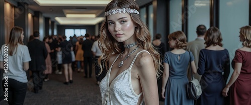 A woman with long blonde hair is standing in front of a restaurant. She is wearing a flower headband and a white tank top. There are several other people in the background