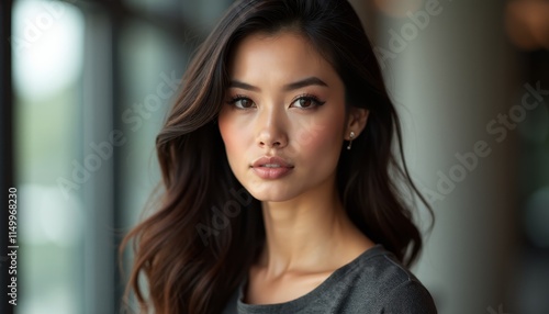 woman, beauty, face, hair, brunette, model, person, fashion, smile, eye, skin, smiling, people, closeup, looking, closeup, black, 1, head, studio, make-up, lady, lip, long