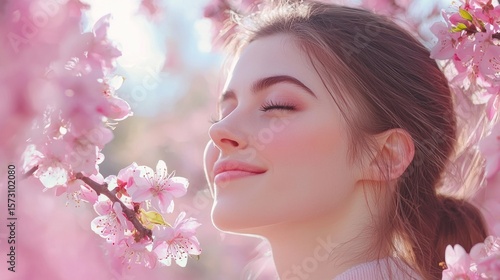 woman, garden, pink, long, brown, hair, springtime, top, flower, beauty, floral, spring, nature, wearing, standing, flower