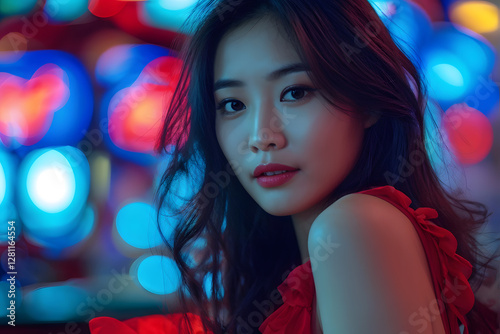 woman, long, dark, hair, red, lipstick, sitting, beauty, blue, neon, female, glowing, brightly, front, portrait, face, signs, main, sharpened, attractive, young, person, white, model, pretty, lady, adult, cute, lifestyle, caucasian, fashion, 1, background, nature, looking, green, style, posing, brunette, park, outside, summer, dress, thai, street, casual attire, healthy, black