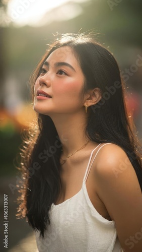 A woman with long dark hair in a white spaghetti-strap top gazes upward as warm sunlight glows behind her. Concept Golden hour portrait, Backlit glow, Gazing upward, White spaghetti-strap top