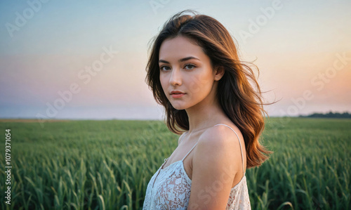 woman, girl, field, grass, green, hair, long, dark, wind, blowing, tank top, white, sky, blue, pink, orange, looking, camera, sunset, nature, outdoors, portrait, summer, beautiful, pretty, model, fashion, casual attire, relaxed, carefree, happy, smile, peaceful, serene, tranquil, calm, soft, gentle, dreamy, romantic