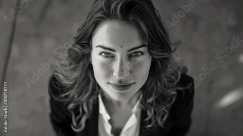 A woman with long hair and a black jacket and white shirt