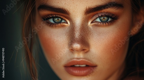 A woman with perfectly contoured cheeks and bold, metallic eyeshadow, looking into the camera with a strong, captivating gaze.