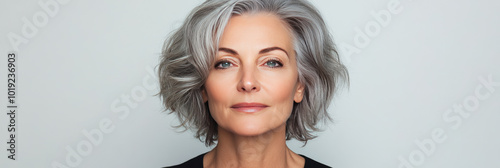 woman, grey hair, short hair, confident, serious, portrait, head shot, white background, minimalist, mature woman, middle-aged, 50s, 60s, female, beauty, fashion, style, elegant, professional, business, mature, pose