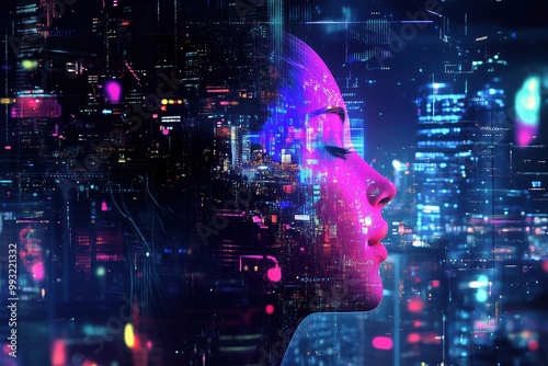 woman, face, city landscape, futuristic, vibe, city, neon, technology, ai, light, impression, digital, earth, giving, concept, screen, science, cyber, brain, network, human, artificial, future, background, information, intelligence, abstract, head, virtual, business, learning, computer, mind, blue, cyberspace, robot, innovation, machine, neural, communication, connection, cyborg, artificial intelligence, design, profile, silhouette, tech, cognition, online