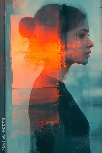 A woman's face is shown in a distorted way, with a blue background and orange and red splatters. The image has a surreal and dreamlike quality