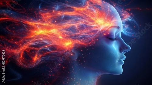 woman, face, profile, cosmic, energy, fire, flames, spark, glowing, nebula, galaxy, star, space, abstract, art, digital, illustration, surreal, fantasy, mystical, aethereal, spiritual, vibrant, colourful, blue, red, orange, dark, background, bright, light, head, closed, eye, nose, mouth, chin, neck, glow, luminescent, shimmering, swirling, flowing