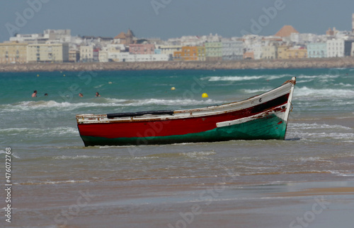 A wooden boat, a patera, was abandoned by illegal migrants at the coast of Cadiz, Spain.