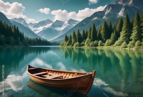 A wooden boat floating on a serene lake surrounded by majestic snow-capped mountains in the background