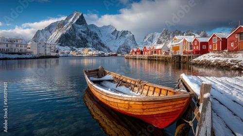 A wooden boat sits on a snowy dock by a calm fjord, with colorful houses and dramatic snow-covered mountains in the background