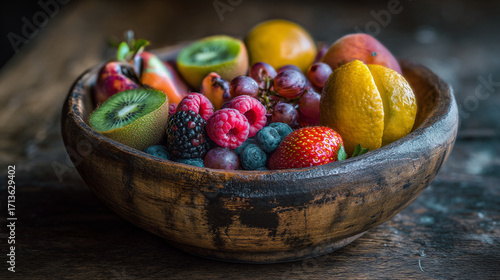 fruit, bowl, wooden, fresh, strawberry, raspberry, blueberry, grape, kiwi, lemon, blackberry, peach, still life, food, healthy, nourishment, sweet, delicious, ripe, organic, natural, table, surface, topview, closeup, macro, vibrant, colours, texture, detail, arrangement, composition, culinary, ingredient, diet, vitamin, antioxidant, refreshing, snack, dessert, rustic, wooden bowl