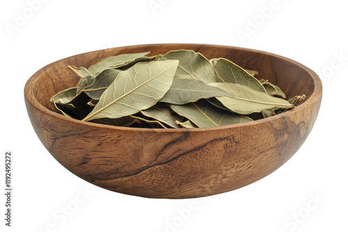 a wooden bowl filled with dried bay leaves isolated on transparent background