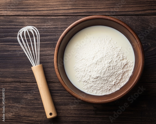 A wooden bowl filled with flour sits on a dark wooden surface, accompanied by a whisk, suggesting a baking or cooking scene.