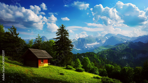 mountain, vale, cabin, wooden, green, tree, forest, nature, scenic, landscape, sky, cloud, blue, summer, tranquil, peaceful, wilderness, alpine, hill, travel, destination, adventure, remote, scenic view, idylli, picturesque, harmony, environment, breathtaking, fresh air, relaxation, serenity, calmness, mountain chain, mountain peak, mountainous, alpine meadow, foliage, greenery, meadow, countryside, rural, natural beauty