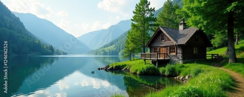 A wooden cabin nestled among lush greenery by a serene lake, , environment