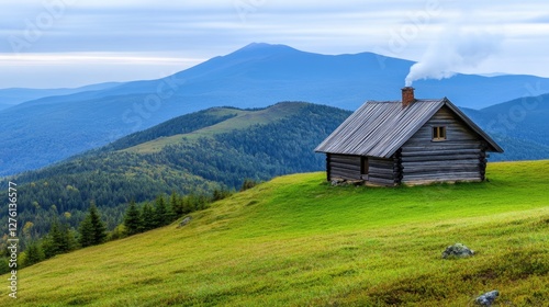 cabin, mountain, landscape, nature, house, hill, forest, wood, green, rural, scenery, rustic, travel, countryside, sky, cloud, summer, smoke, chimney, wooden, grass, environment, tranquil, natural, idylli, peak, range, tree, day, view, pastoral, escape, holiday, retreat, altitude, scenic, remote, serene, vista, horizon, fresh, quiet, country, exploration, adventure, vacation, destination, outdoors