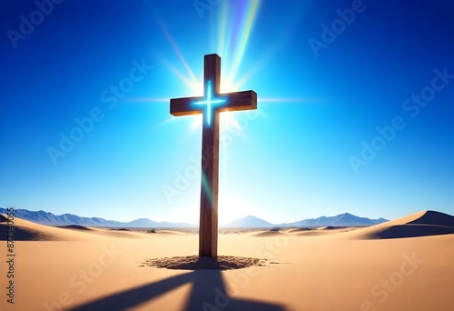 A wooden cross standing in a desert landscape, with a bright light shining from behind it against a blue sky