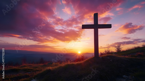 A wooden cross standing tall on a hill at sunrise, symbolizing hope and faith against the backdrop of a glowing sky.