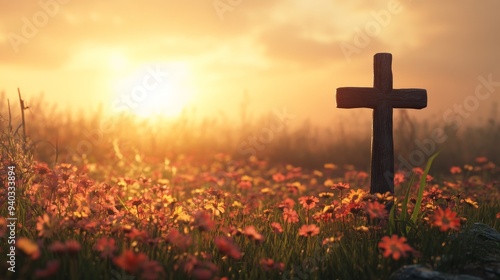 A wooden cross stands tall in a field of wildflowers as the sun sets, casting a warm glow over the landscape. This image symbolizes faith, hope, and the beauty of nature.