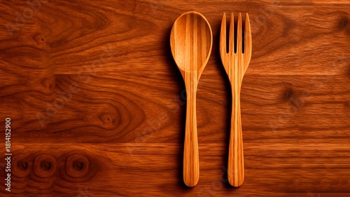 A wooden fork and spoon arranged on a wooden board background, ideal for wellness and habit-tracking visuals.