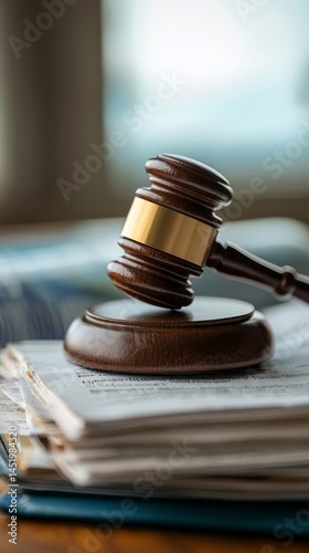 A wooden gavel is placed on top of a pile of legal documents, symbolizing justice and law. This arrangement suggests an ongoing legal proceeding or decision-making process