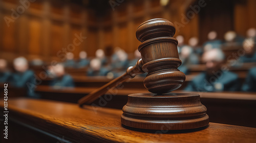A wooden gavel sits on a wooden podium in front of a crowd of people. The gavel is being used by a judge in a courtroom