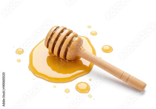 A wooden honey dipper resting in a small pool of golden honey with scattered drops on a clean white background