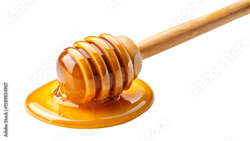 A wooden honey dipper with dripping honey, isolated on transparent background