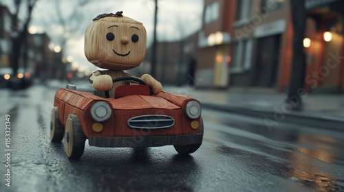 A wooden robot toy is captured driving a vintage red car down a rainy street. The wet pavement and urban backdrop create a blend of nostalgia and creativity, perfect for concepts like childhood